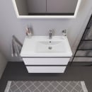 Møblets to skuffer har et smalt og slankt grep, som dekker hele skuffens bredde og matcher flott med servantskapets farge.