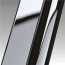 Dette sidefeltet har rektangulær form og er laget av klart glass med en tykkelse på 8 mm. Profilene er produsert i PVD-behandlet aluminium, som gir slitestyrke og flere fargevalg. På bildet vises modellen med børstet messing, men du kan velge mellom profil krom, sort matt, børstet bronse, messing, børstet kobber, børstet messing, børstet stål, hvit matt, sort krom og børstet grafitt.